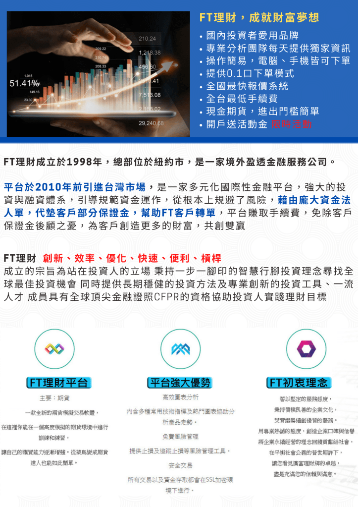 【關於FT期貨】 FT系統是一款采用亞洲知名平台開發團隊提供之交易平台、高度個性化的平台,先進的技術圖表,即時的報價,支持軟體下載、網頁瀏覽器、ipad、iphone、安卓等,交易者可以隨時隨地透過簡單易明的介面建立及管理交易 前往平台交易 _ _ _ 領取模擬帳號